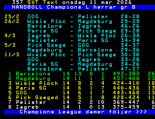 HANDBOLL Champions L herrar gr B 25/2 GOG - Pelister 28-28 26/2 Wisla Ploc - Magdeburg 29-29 Barcelona - Zagreb 46-26 Paris SG - Pick Szege 29-28 4/3 Zagreb - Wisla Ploc 26-34 Pelister - Paris SG 34-34 5/3 Pick Szege - GOG 34-37 Magdeburg - Barcelona 29-36 11/3 Wisla Ploc - Pick Szege 30-30 GOG - Zagreb 33-28 Paris SG - Magdeburg 34-26 Barcelona - Pelister 47-27 1 Barcelona 14 13 0 1 492-382 26 2 Magdeburg 14 11 1 2 457-408 23 3 Wisla Plock 14 8 2 4 424-410 18 4 Paris SG 14 6 1 7 446-436 13 5 GOG 14 6 1 7 443-468 13 6 Pick Szeged 14 5 1 8 428-424 11 7 Pelister 14 2 2 10 369-447 6 8 Zagreb 14 1 0 13 375-459 2 Champions League damer följer >>> +Dela 42 dagar