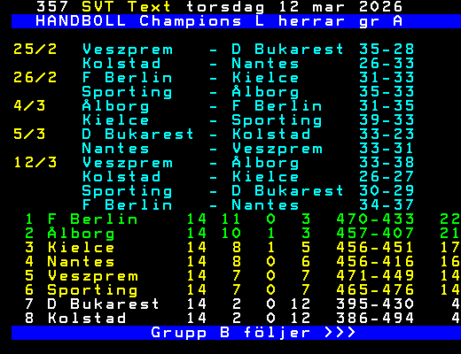 HANDBOLL Champions L herrar gr A 25/2 Veszprem - D Bukarest 35-28 Kolstad - Nantes 26-33 26/2 F Berlin - Kielce 31-33 Sporting - Ålborg 35-33 4/3 Ålborg - F Berlin 31-35 Kielce - Sporting 39-33 5/3 D Bukarest - Kolstad 33-23 Nantes - Veszprem 33-31 12/3 Veszprem - Ålborg 33-38 Kolstad - Kielce 26-27 Sporting - D Bukarest 30-29 F Berlin - Nantes 34-37 1 F Berlin 14 11 0 3 470-433 22 2 Ålborg 14 10 1 3 457-407 21 3 Kielce 14 8 1 5 456-451 17 4 Nantes 14 8 0 6 456-416 16 5 Veszprem 14 7 0 7 471-449 14 6 Sporting 14 7 0 7 465-476 14 7 D Bukarest 14 2 0 12 395-430 4 8 Kolstad 14 2 0 12 386-494 4 Grupp B följer >>> +Dela 41 dagar