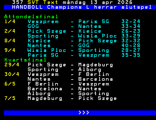 SVT Text Mån 13 Apr. 2026 HANDBOLL Champions L herrar slutspel Åttondelsfinal 1/4 Veszprem - Paris SG 32-24 GOG - Nantes 33-34 2/4 Pick Szege - Kielce 26-23 Sporting - Wisla Ploc 33-29 8/4 Kielce - Pick Szege 32-32 Nantes - GOG 40-28 9/4 Wisla Ploc - Sporting 28-27 Paris SG - Veszprem 35-35 Kvartsfinal 29/4 Pick Szege - Magdeburg Sporting - Ålborg 30/4 Veszprem - F Berlin Nantes - Barcelona 6/5 F Berlin - Veszprem Barcelona - Nantes Ålborg - Sporting 7/5 Magdeburg - Pick Szege >>> +Dela 10 dagar