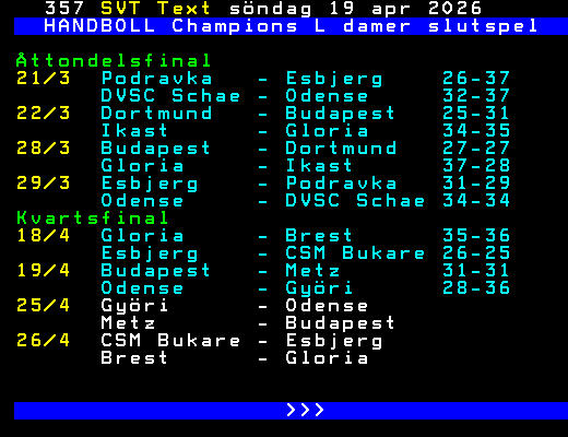 HANDBOLL Champions L damer slutspel Åttondelsfinal 21/3 Podravka - Esbjerg 26-37 DVSC Schae - Odense 32-37 22/3 Dortmund - Budapest 25-31 Ikast - Gloria 34-35 28/3 Budapest - Dortmund 27-27 Gloria - Ikast 37-28 29/3 Esbjerg - Podravka 31-29 Odense - DVSC Schae 34-34 Kvartsfinal 18/4 Gloria - Brest 35-36 Esbjerg - CSM Bukare 26-25 19/4 Budapest - Metz 31-31 Odense - Györi 28-36 25/4 Györi - Odense Metz - Budapest 26/4 CSM Bukare - Esbjerg Brest - Gloria >>> +Dela 3 dagar
