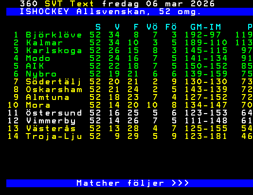 ISHOCKEY Allsvenskan, 52 omg. S V F VÖ FÖ GM-IM P 1 Björklöve 52 34 8 7 3 192-97 119 2 Kalmar 52 34 10 3 5 189-110 113 3 Karlskoga 52 26 15 8 3 145-115 97 4 Modo 52 24 16 7 5 141-134 91 5 AIK 52 22 18 7 5 150-152 85 6 Nybro 52 19 21 6 6 139-159 75 7 Södertälj 52 20 21 2 9 130-130 73 8 Oskarsham 52 21 24 2 5 143-139 72 9 Almtuna 52 18 23 7 4 127-152 72 10 Mora 52 14 20 10 8 134-147 70 11 Östersund 52 16 25 5 6 123-153 64 12 Vimmerby 52 14 26 7 5 111-148 61 13 Västerås 52 13 28 4 7 125-155 54 14 Troja-Lju 52 9 29 5 9 123-181 46 Matcher följer >>> +Dela 47 dagar