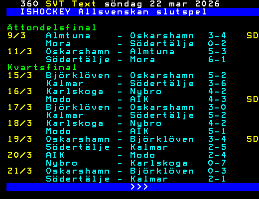 ISHOCKEY Allsvenskan slutspel Åttondelsfinal 9/3 Almtuna - Oskarshamn 3-4 SD Mora - Södertälje 0-2 11/3 Oskarshamn - Almtuna 5-3 Södertälje - Mora 6-1 Kvartsfinal 15/3 Björklöven - Oskarshamn 5-2 Kalmar - Södertälje 3-6 16/3 Karlskoga - Nybro 4-2 Modo - AIK 4-3 SD 17/3 Björklöven - Oskarshamn 3-0 Kalmar - Södertälje 5-2 18/3 Karlskoga - Nybro 4-2 Modo - AIK 5-1 19/3 Oskarshamn - Björklöven 3-4 SD Södertälje - Kalmar 2-5 20/3 AIK - Modo 2-4 Nybro - Karlskoga 0-7 21/3 Oskarshamn - Björklöven 0-3 Södertälje - Kalmar 2-1 >>> +Dela 32 dagar