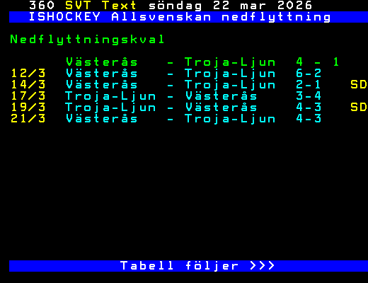 ISHOCKEY Allsvenskan nedflyttning Nedflyttningskval Västerås - Troja-Ljun 4 - 1 12/3 Västerås - Troja-Ljun 6-2 14/3 Västerås - Troja-Ljun 2-1 SD 17/3 Troja-Ljun - Västerås 3-4 19/3 Troja-Ljun - Västerås 4-3 SD 21/3 Västerås - Troja-Ljun 4-3 Tabell följer >>> +Dela 32 dagar