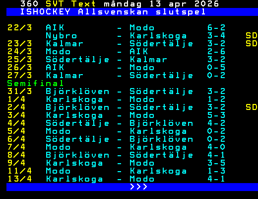 ISHOCKEY Allsvenskan slutspel 22/3 AIK - Modo 6-2 Nybro - Karlskoga 3-4 SD 23/3 Kalmar - Södertälje 3-2 SD 24/3 Modo - AIK 2-6 25/3 Södertälje - Kalmar 3-2 26/3 AIK - Modo 0-5 27/3 Kalmar - Södertälje 0-2 Semifinal 31/3 Björklöven - Södertälje 3-2 1/4 Karlskoga - Modo 1-2 2/4 Björklöven - Södertälje 3-2 SD 3/4 Karlskoga - Modo 5-3 4/4 Södertälje - Björklöven 4-2 5/4 Modo - Karlskoga 0-2 6/4 Södertälje - Björklöven 0-2 7/4 Modo - Karlskoga 4-0 8/4 Björklöven - Södertälje 4-1 9/4 Karlskoga - Modo 3-5 11/4 Modo - Karlskoga 1-3 13/4 Karlskoga - Modo 4-1 >>> +Dela 9 dagar