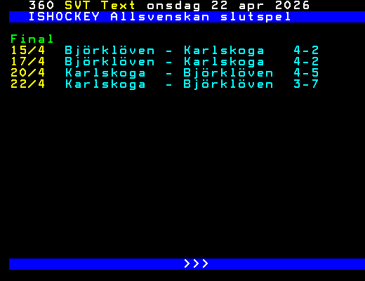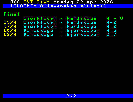 SVT Text Ons 22 Apr. 2026 ISHOCKEY Allsvenskan slutspel Final Björklöven - Karlskoga 4 - 0 15/4 Björklöven - Karlskoga 4-2 17/4 Björklöven - Karlskoga 4-2 20/4 Karlskoga - Björklöven 4-5 22/4 Karlskoga - Björklöven 3-7 >>> +Dela Igår 21:40
