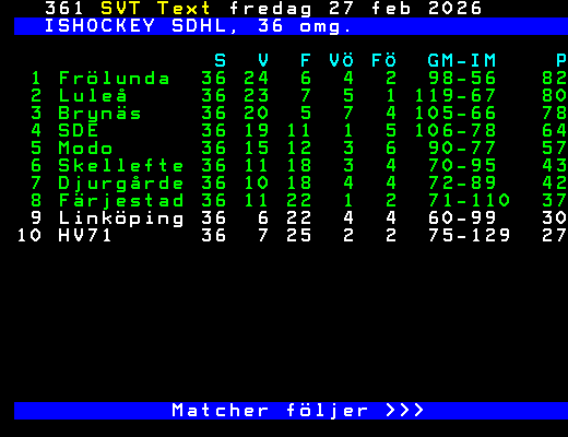 ISHOCKEY SDHL, 36 omg. S V F VÖ FÖ GM-IM P 1 Frölunda 36 24 6 4 2 98-56 82 2 Luleå 36 23 7 5 1 119-67 80 3 Brynäs 36 20 5 7 4 105-66 78 4 SDE 36 19 11 1 5 106-78 64 5 Modo 36 15 12 3 6 90-77 57 6 Skellefte 36 11 18 3 4 70-95 43 7 Djurgårde 36 10 18 4 4 72-89 42 8 Färjestad 36 11 22 1 2 71-110 37 9 Linköping 36 6 22 4 4 60-99 30 10 HV71 36 7 25 2 2 75-129 27 Matcher följer >>> +Dela 54 dagar