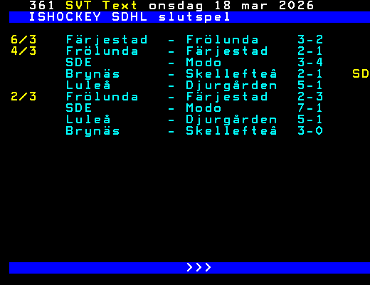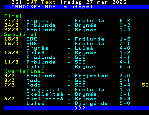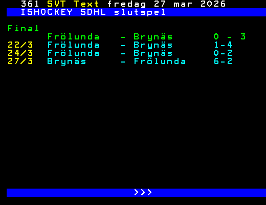 SVT Text Fre 27 Mars 2026 ISHOCKEY SDHL slutspel Final 27/3 Brynäs - Frölunda 6-2 24/3 Frölunda - Brynäs 0-2 22/3 Frölunda - Brynäs 1-4 Semifinal 18/3 SDE - Frölunda 1-2 16/3 SDE - Frölunda 3-1 Brynäs - Luleå 4-0 13/3 Luleå - Brynäs 1-2 Frölunda - SDE 4-1 11/3 Frölunda - SDE 4-1 Luleå - Brynäs 2-3 Kvartsfinal 9/3 Frölunda - Färjestad 3-0 8/3 Modo - SDE 0-1 7/3 Modo - SDE 3-4 SD Färjestad - Frölunda 1-3 Skellefteå - Brynäs 0-1 6/3 Skellefteå - Brynäs 5-3 Luleå - Djurgården 5-0 >>> +Dela 26 dagar