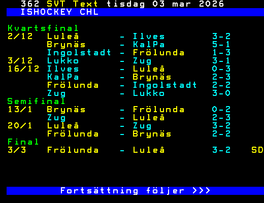 SVT Text Tis 03 Mars 2026 ISHOCKEY CHL Kvartsfinal 2/12 Luleå - Ilves 3-2 Brynäs - KalPa 5-1 Ingolstadt - Frölunda 1-3 3/12 Lukko - Zug 3-1 16/12 Ilves - Luleå 0-3 KalPa - Brynäs 2-3 Frölunda - Ingolstadt 2-2 Zug - Lukko 3-0 Semifinal 13/1 Brynäs - Frölunda 0-2 Zug - Luleå 2-3 20/1 Luleå - Zug 3-2 Frölunda - Brynäs 2-2 Final 3/3 Frölunda - Luleå 3-2 SD Fortsättning följer >>> +Dela 50 dagar