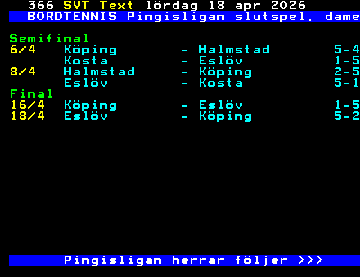BORDTENNIS Pingisligan slutspel, dame Semifinal 6/4 Köping - Halmstad 5-4 Kosta - Eslöv 1-5 8/4 Halmstad - Köping 2-5 Eslöv - Kosta 5-1 Final 16/4 Köping - Eslöv 1-5 18/4 Eslöv - Köping 5-2 Pingisligan herrar följer >>> +Dela 4 dagar
