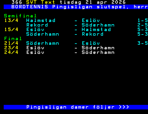 SVT Text Tis 21 Apr. 2026 BORDTENNIS Pingisligan slutspel, herr Semifinal 13/4 Halmstad - Eslöv 1-5 Rekord - Söderhamn 2-5 15/4 Eslöv - Halmstad 5-3 Söderhamn - Rekord 5-3 Final 21/4 Söderhamn - Eslöv 3-5 23/4 Eslöv - Söderhamn 24/4 Eslöv - Söderhamn Pingisligan damer följer >>> +Dela 1 dag