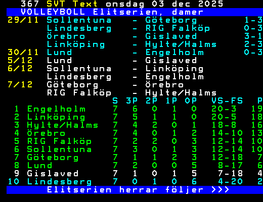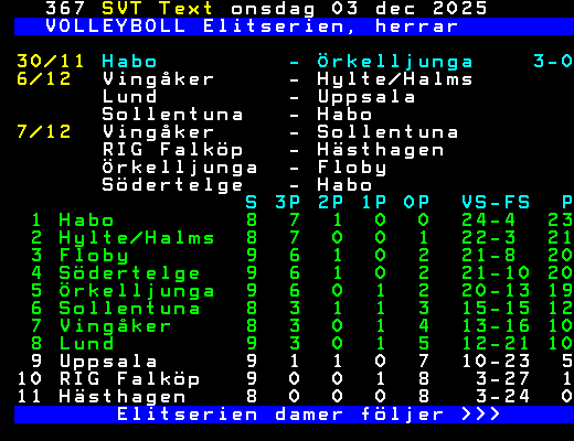 SVT Text Ons 03 Dec. 2025 VOLLEYBOLL Elitserien, herrar 30/11 Habo - Örkelljunga 3-0 6/12 Vingåker - Hylte/Halms Lund - Uppsala Sollentuna - Habo 7/12 Vingåker - Sollentuna RIG Falköp - Hästhagen Örkelljunga - Floby Södertelge - Habo S 3P 2P 1P 0P VS-FS P 1 Habo 8 7 1 0 0 24-4 23 2 Hylte/Halms 8 7 0 0 1 22-3 21 3 Floby 9 6 1 0 2 21-8 20 4 Södertelge 9 6 1 0 2 21-10 20 5 Örkelljunga 9 6 0 1 2 20-13 19 6 Sollentuna 8 3 1 1 3 15-15 12 7 Vingåker 8 3 0 1 4 13-16 10 8 Lund 9 3 0 1 5 12-21 10 9 Uppsala 9 1 1 0 7 10-23 5 10 RIG Falköp 9 0 0 1 8 3-27 1 11 Hästhagen 8 0 0 0 8 3-24 0 Elitserien damer följer >>> +Dela Igår 10:50