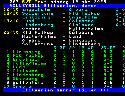 SVT Text Lör 18 Okt. 2025 VOLLEYBOLL Elitserien, herrar 12/10 Sollentuna - Hästhagen 3-1 17/10 Lund - RIG Falköp 3-1 18/10 Hästhagen - Floby 0-3 Södertelge - Sollentuna 3-0 21/10 Habo - Hylte/Halms 25/10 Uppsala - Habo RIG Falköp - Floby Sollentuna - Lund Hästhagen - Vingåker S 3P 2P 1P 0P VS-FS P 1 Södertelge 3 2 1 0 0 9-2 8 2 Floby 2 2 0 0 0 6-0 6 3 Örkelljunga 2 1 0 1 0 5-3 4 4 Hylte/Halms 1 1 0 0 0 3-0 3 5 Sollentuna 2 1 0 0 1 3-4 3 6 Lund 2 1 0 0 1 3-4 3 7 Habo 0 0 0 0 0 0-0 0 7 Vingåker 0 0 0 0 0 0-0 0 9 Hästhagen 2 0 0 0 2 1-6 0 10 RIG Falköp 3 0 0 0 3 1-9 0 11 Uppsala 1 0 0 0 1 0-3 0 Elitserien damer följer >>> +Dela Igår 18:35