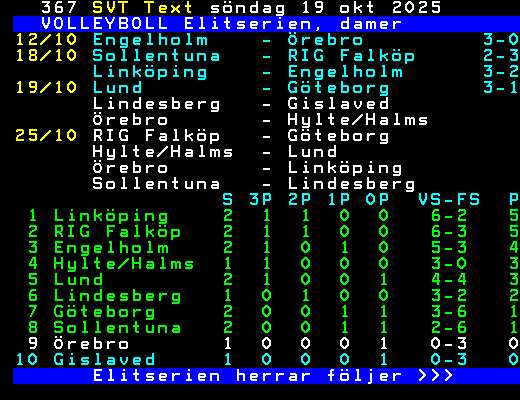 SVT Text Lör 18 Okt. 2025 VOLLEYBOLL Elitserien, herrar 12/10 Sollentuna - Hästhagen 3-1 17/10 Lund - RIG Falköp 3-1 18/10 Hästhagen - Floby 0-3 Södertelge - Sollentuna 3-0 21/10 Habo - Hylte/Halms 25/10 Uppsala - Habo RIG Falköp - Floby Sollentuna - Lund Hästhagen - Vingåker S 3P 2P 1P 0P VS-FS P 1 Södertelge 3 2 1 0 0 9-2 8 2 Floby 2 2 0 0 0 6-0 6 3 Örkelljunga 2 1 0 1 0 5-3 4 4 Hylte/Halms 1 1 0 0 0 3-0 3 5 Sollentuna 2 1 0 0 1 3-4 3 6 Lund 2 1 0 0 1 3-4 3 7 Habo 0 0 0 0 0 0-0 0 7 Vingåker 0 0 0 0 0 0-0 0 9 Hästhagen 2 0 0 0 2 1-6 0 10 RIG Falköp 3 0 0 0 3 1-9 0 11 Uppsala 1 0 0 0 1 0-3 0 Elitserien damer följer >>> +Dela Igår 18:35