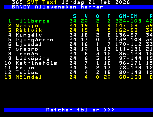 BANDY Allsvenskan herrar S V O F GM-IM P 1 Tillberga 24 20 2 2 224-103 42 2 Nässjö 24 19 1 4 147-58 39 3 Rättvik 24 15 4 5 162-98 34 4 Kungälv 24 16 2 6 136-97 34 5 Djurgården 24 17 0 7 139-108 34 6 Ljusdal 24 16 1 7 170-112 33 7 Örebro 24 10 1 13 111-131 21 8 Tranås 24 6 3 15 86-128 15 9 Lidköping 24 6 3 15 97-144 15 10 Katrineholm 24 7 1 16 96-171 15 11 Falun 24 5 2 17 78-128 12 12 Tellus 24 4 2 18 80-148 10 13 Mölndal 24 4 0 20 68-168 8 Matcher följer >>> +Dela 54 dagar
