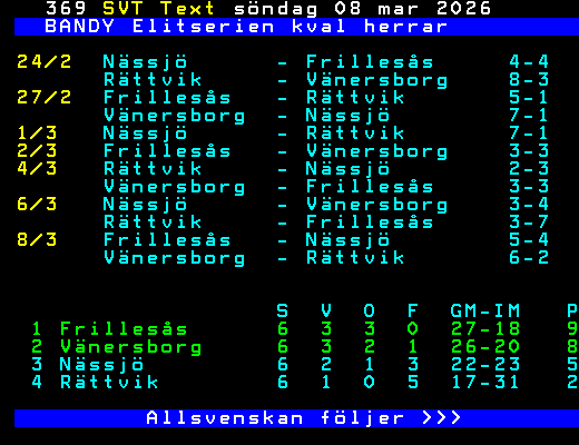 SVT Text Sön 08 Mars 2026 BANDY Elitserien kval herrar 24/2 Nässjö - Frillesås 4-4 Rättvik - Vänersborg 8-3 27/2 Frillesås - Rättvik 5-1 Vänersborg - Nässjö 7-1 1/3 Nässjö - Rättvik 7-1 2/3 Frillesås - Vänersborg 3-3 4/3 Rättvik - Nässjö 2-3 Vänersborg - Frillesås 3-3 6/3 Nässjö - Vänersborg 3-4 Rättvik - Frillesås 3-7 8/3 Frillesås - Nässjö 5-4 Vänersborg - Rättvik 6-2 S V O F GM-IM P 1 Frillesås 6 3 3 0 27-18 9 2 Vänersborg 6 3 2 1 26-20 8 3 Nässjö 6 2 1 3 22-23 5 4 Rättvik 6 1 0 5 17-31 2 Allsvenskan följer >>> +Dela 39 dagar