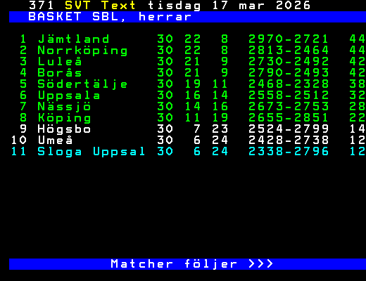 BASKET SBL, herrar 1 Jämtland 30 22 8 2970-2721 44 2 Norrköping 30 22 8 2813-2464 44 3 Luleå 30 21 9 2730-2492 42 4 Borås 30 21 9 2790-2493 42 5 Södertälje 30 19 11 2468-2328 38 6 Uppsala 30 16 14 2558-2512 32 7 Nässjö 30 14 16 2673-2753 28 8 Köping 30 11 19 2655-2851 22 9 Högsbo 30 7 23 2524-2799 14 10 Umeå 30 6 24 2428-2738 12 11 Sloga Uppsal 30 6 24 2338-2796 12 Matcher följer >>> +Dela 36 dagar