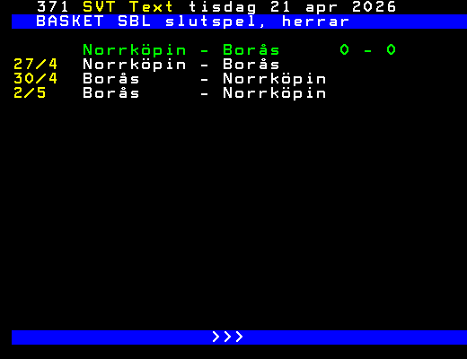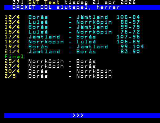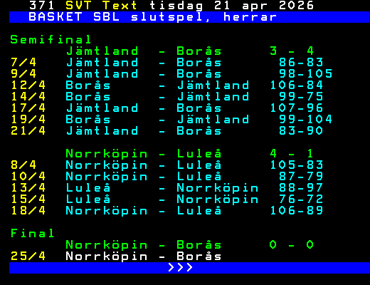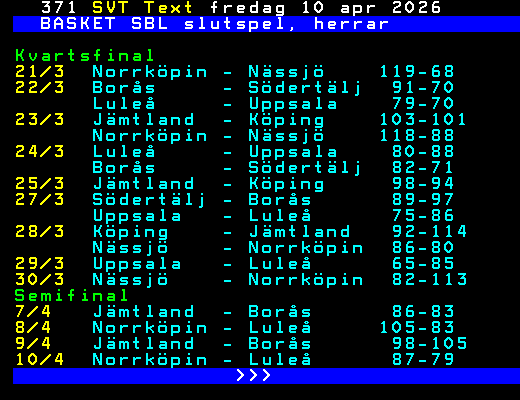 SVT Text Fre 10 Apr. 2026 BASKET SBL slutspel, herrar Kvartsfinal 21/3 Norrköpin - Nässjö 119-68 22/3 Borås - Södertälj 91-70 Luleå - Uppsala 79-70 23/3 Jämtland - Köping 103-101 Norrköpin - Nässjö 118-88 24/3 Luleå - Uppsala 80-88 Borås - Södertälj 82-71 25/3 Jämtland - Köping 98-94 27/3 Södertälj - Borås 89-97 Uppsala - Luleå 75-86 28/3 Köping - Jämtland 92-114 Nässjö - Norrköpin 86-80 29/3 Uppsala - Luleå 65-85 30/3 Nässjö - Norrköpin 82-113 Semifinal 7/4 Jämtland - Borås 86-83 8/4 Norrköpin - Luleå 105-83 9/4 Jämtland - Borås 98-105 10/4 Norrköpin - Luleå 87-79 >>> +Dela 12 dagar