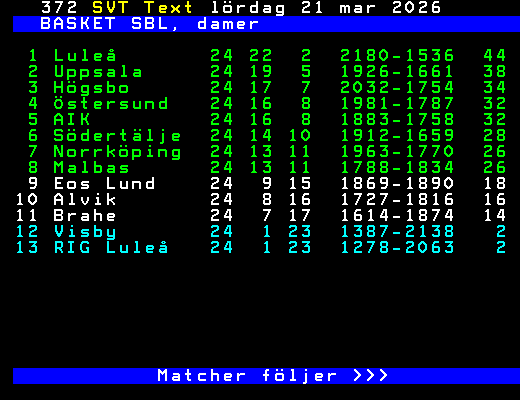 BASKET SBL, damer 1 Luleå 24 22 2 2180-1536 44 2 Uppsala 24 19 5 1926-1661 38 3 Högsbo 24 17 7 2032-1754 34 4 Östersund 24 16 8 1981-1787 32 5 AIK 24 16 8 1883-1758 32 6 Södertälje 24 14 10 1912-1659 28 7 Norrköping 24 13 11 1963-1770 26 8 Malbas 24 13 11 1788-1834 26 9 Eos Lund 24 9 15 1869-1890 18 10 Alvik 24 8 16 1727-1816 16 11 Brahe 24 7 17 1614-1874 14 12 Visby 24 1 23 1387-2138 2 13 RIG Luleå 24 1 23 1278-2063 2 Matcher följer >>> +Dela 32 dagar