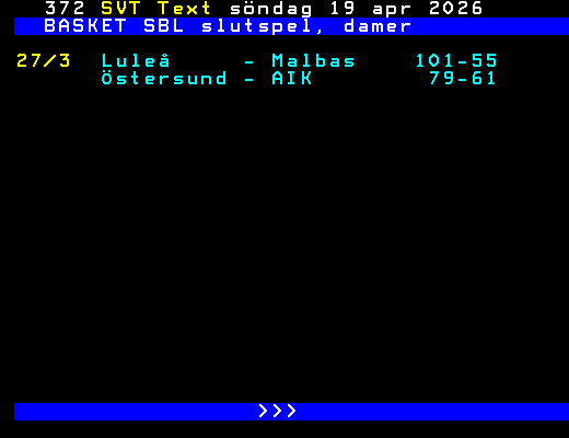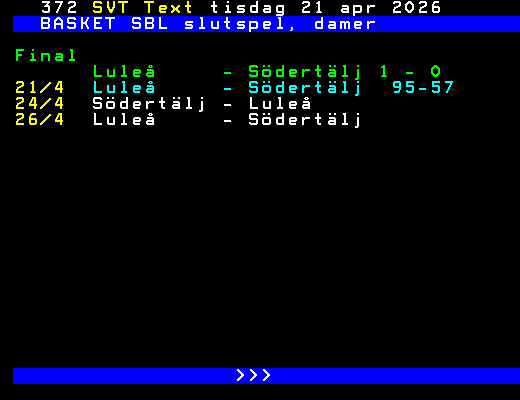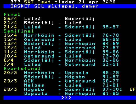 SVT Text Tis 21 Apr. 2026 BASKET SBL slutspel, damer Final 26/4 Luleå - Södertälj 24/4 Södertälj - Luleå 21/4 Luleå - Södertälj 95-57 Semifinal 16/4 Norrköpin - Södertälj 76-78 15/4 Östersund - Luleå 68-98 13/4 Södertälj - Norrköpin 84-69 12/4 Luleå - Östersund 77-67 11/4 Norrköpin - Södertälj 59-66 10/4 Östersund - Luleå 73-70 8/4 Södertälj - Norrköpin 82-86 7/4 Luleå - Östersund 53-51 Kvartsfinal 30/3 Norrköpin - Uppsala 85-75 Södertälj - Högsbo 91-57 29/3 AIK - Östersund 68-77 Malbas - Luleå 71-81 28/3 Högsbo - Södertälj 97-101 EF Uppsala - Norrköpin 81-85 >>> +Dela 1 dag