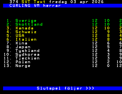 SVT Text Fre 03 Apr. 2026 CURLING VM herrar 1. Sverige 12 10 2 2. Skottland 12 10 2 3. Kanada 12 10 2 4. Schweiz 12 9 3 5. USA 12 8 4 6. Italien 12 8 4 7. Kina 12 6 6 8. Japan 12 5 7 9. Tyskland 12 4 8 10. Sydkorea 12 3 9 11. Tjeckien 12 3 9 12. Polen 12 2 10 13. Norge 12 0 12 Slutspel följer >>> +Dela 2 dagar