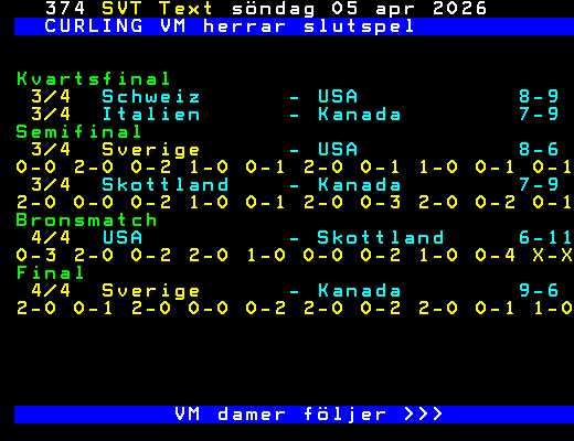 CURLING VM herrar slutspel Kvartsfinal 3/4 Schweiz - USA 8-9 3/4 Italien - Kanada 7-9 Semifinal 3/4 Sverige - USA 8-6 0-0 2-0 0-2 1-0 0-1 2-0 0-1 1-0 0-1 0-1 3/4 Skottland - Kanada 7-9 2-0 0-0 0-2 1-0 0-1 2-0 0-3 2-0 0-2 0-1 Bronsmatch 4/4 USA - Skottland 6-11 0-3 2-0 0-2 2-0 1-0 0-0 0-2 1-0 0-4 X-X Final 4/4 Sverige - Kanada 9-6 2-0 0-1 2-0 0-0 0-2 2-0 0-2 2-0 0-1 1-0 VM damer följer >>> +Dela 01:00