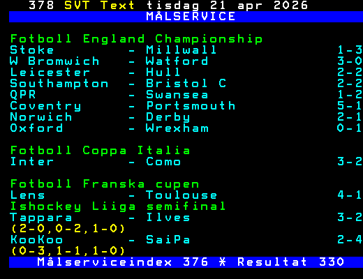 SVT Text Tis 21 Apr. 2026 MÅLSERVICE Fotboll England Championship Stoke - Millwall 1-3 W Bromwich - Watford 3-0 Leicester - Hull 2-2 Southampton - Bristol C 2-2 QPR - Swansea 1-2 Coventry - Portsmouth 5-1 Norwich - Derby 2-1 Oxford - Wrexham 0-1 Fotboll Coppa Italia Inter - Como 3-2 Fotboll Franska cupen Lens - Toulouse 4-1 Ishockey Liiga semifinal Tappara - Ilves 3-2 (2-0,0-2,1-0) KooKoo - SaiPa 2-4 (0-3,1-1,1-0) Målserviceindex 376 * Resultat 330 +Dela 23:13