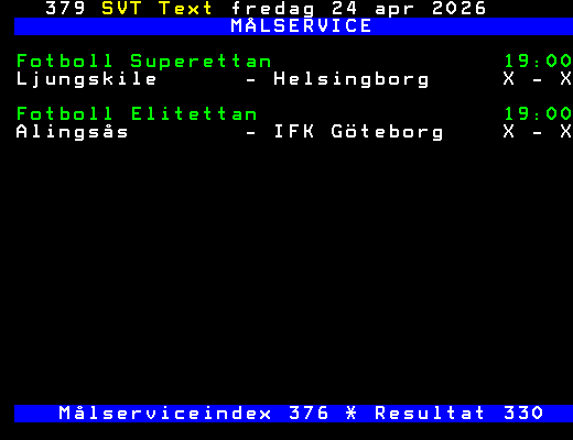 SVT Text Fre 24 Apr. 2026 MÅLSERVICE Fotboll Superettan 19:00 Ljungskile - Helsingborg X - X Fotboll Elitettan 19:00 Alingsås - IFK Göteborg X - X Målserviceindex 376 * Resultat 330 +Dela 09:03