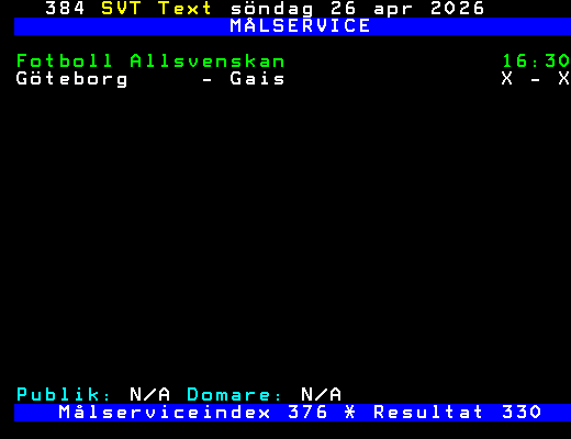 SVT Text Sön 26 Apr. 2026 MÅLSERVICE Fotboll Allsvenskan 16:30 Göteborg - Gais X - X Publik: N/A Domare: N/A Målserviceindex 376 * Resultat 330 +Dela 09:04