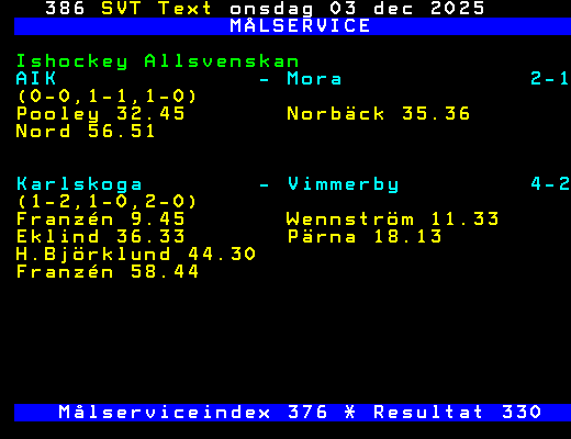 SVT Text Ons 03 Dec. 2025 MÅLSERVICE Ishockey Allsvenskan AIK - Mora 2-1 (0-0,1-1,1-0) Pooley 32.45 Norbäck 35.36 Nord 56.51 Karlskoga - Vimmerby 4-2 (1-2,1-0,2-0) Franzén 9.45 Wennström 11.33 Eklind 36.33 Pärna 18.13 H.Björklund 44.30 Franzén 58.44 Målserviceindex 376 * Resultat 330 +Dela Igår 21:31