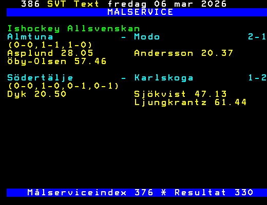 SVT Text Fre 06 Mars 2026 MÅLSERVICE Ishockey Allsvenskan Almtuna - Modo 2-1 (0-0,1-1,1-0) Asplund 28.05 Andersson 20.37 Öby-Olsen 57.46 Södertälje - Karlskoga 1-2 (0-0,1-0,0-1,0-1) Dyk 20.50 Sjökvist 47.13 Ljungkrantz 61.44 Målserviceindex 376 * Resultat 330 +Dela Igår 21:41