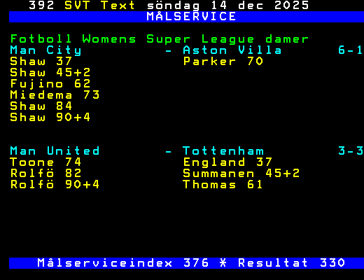 SVT Text Sön 14 Dec. 2025 MÅLSERVICE Fotboll Womens Super League damer Man City - Aston Villa 6-1 Shaw 37 Parker 70 Shaw 45+2 Fujino 62 Miedema 73 Shaw 84 Shaw 90+4 Man United - Tottenham 3-3 Toone 74 England 37 Rolfö 82 Summanen 45+2 Rolfö 90+4 Thomas 61 Målserviceindex 376 * Resultat 330 +Dela Igår 17:29