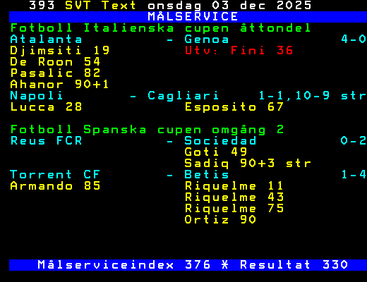 SVT Text Ons 03 Dec. 2025 MÅLSERVICE Fotboll Italienska cupen åttondel Atalanta - Genoa 4-0 Djimsiti 19 Utv: Fini 36 De Roon 54 Pasalic 82 Ahanor 90+1 Napoli - Cagliari 1-1,10-9 str Lucca 28 Esposito 67 Fotboll Spanska cupen omgång 2 Reus FCR - Sociedad 0-2 Goti 49 Sadiq 90+3 str Torrent CF - Betis 1-4 Armando 85 Riquelme 11 Riquelme 43 Riquelme 75 Ortiz 90 Målserviceindex 376 * Resultat 330 +Dela Igår 23:00