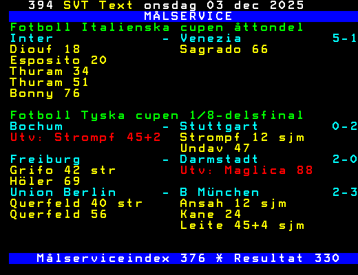 SVT Text Ons 03 Dec. 2025 MÅLSERVICE Fotboll Italienska cupen åttondel Inter - Venezia 5-1 Diouf 18 Sagrado 66 Esposito 20 Thuram 34 Thuram 51 Bonny 76 Fotboll Tyska cupen 1/8-delsfinal Bochum - Stuttgart 0-2 Utv: Strompf 45+2 Strompf 12 sjm Undav 47 Freiburg - Darmstadt 2-0 Grifo 42 str Utv: Maglica 88 Höler 69 Union Berlin - B München 2-3 Querfeld 40 str Ansah 12 sjm Querfeld 56 Kane 24 Leite 45+4 sjm Målserviceindex 376 * Resultat 330 +Dela Igår 22:54