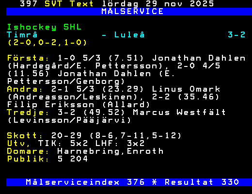 SVT Text Lör 29 Nov. 2025 MÅLSERVICE Ishockey SHL Timrå - Luleå 3-2 (2-0,0-2,1-0) Första: 1-0 5/3 (7.51) Jonathan Dahlen (Hardegård/E. Pettersson), 2-0 4/5 (11.56) Jonathan Dahlen (E. Pettersson/Genborg) Andra: 2-1 5/3 (23.29) Linus Omark (Andreasson/Leskinen), 2-2 (35.46) Filip Eriksson (Allard) Tredje: 3-2 (49.52) Marcus Westfält (Levinsson/Pääjärvi) Skott: 20-29 (8-6,7-11,5-12) Utv, TIK: 5x2 LHF: 3x2 Domare: Harnebring,Enroth Publik: 5 204 Målserviceindex 376 * Resultat 330 +Dela 4 dagar