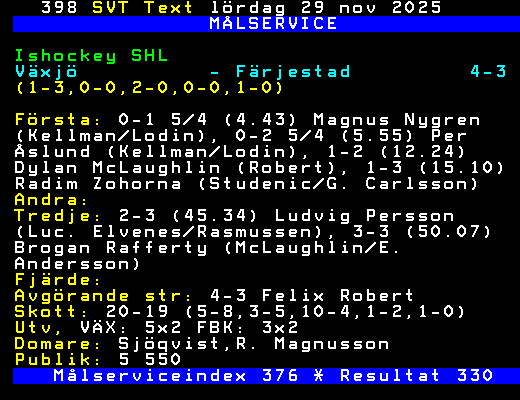 SVT Text Lör 29 Nov. 2025 MÅLSERVICE Ishockey SHL Växjö - Färjestad 4-3 (1-3,0-0,2-0,0-0,1-0) Första: 0-1 5/4 (4.43) Magnus Nygren (Kellman/Lodin), 0-2 5/4 (5.55) Per Åslund (Kellman/Lodin), 1-2 (12.24) Dylan McLaughlin (Robert), 1-3 (15.10) Radim Zohorna (Studenic/G. Carlsson) Andra: Tredje: 2-3 (45.34) Ludvig Persson (Luc. Elvenes/Rasmussen), 3-3 (50.07) Brogan Rafferty (McLaughlin/E. Andersson) Fjärde: Avgörande str: 4-3 Felix Robert Skott: 20-19 (5-8,3-5,10-4,1-2,1-0) Utv, VÄX: 5x2 FBK: 3x2 Domare: Sjöqvist,R. Magnusson Publik: 5 550 Målserviceindex 376 * Resultat 330 +Dela 4 dagar