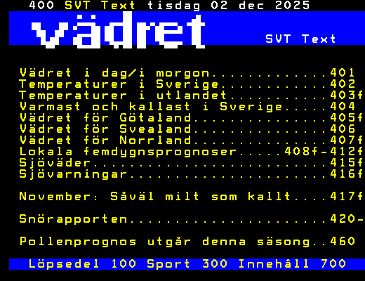 SVT Text Tis 02 Dec. 2025 SVT Text Vädret i dag/i morgon.............401 Temperaturer i Sverige............402 Temperaturer i utlandet...........403f Varmast och kallast i Sverige.....404 Vädret för Götaland...............405f Vädret för Svealand...............406 Vädret för Norrland...............407f Lokala femdygnsprognoser.....408f-412f Sjöväder..........................415f Sjövarningar......................416f November: Såväl milt som kallt....417f Snörapporten......................420- Pollenprognos utgår denna säsong..460 Löpsedel 100 Sport 300 Innehåll 700 +Dela 1 dag