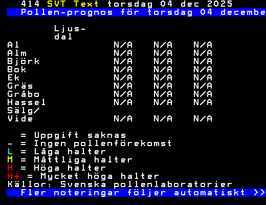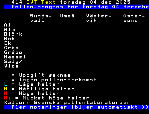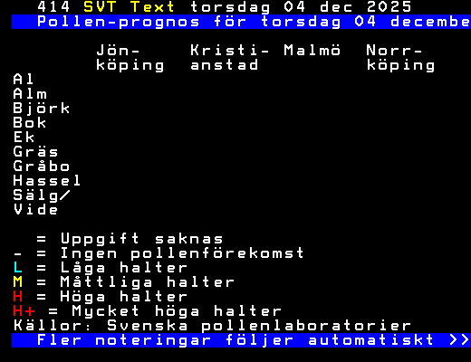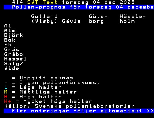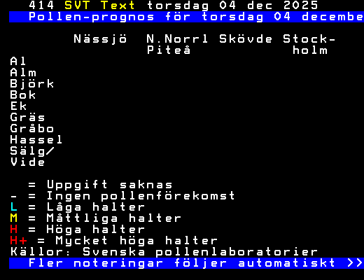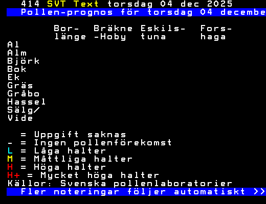 SVT Text Tors 04 Dec. 2025 Pollen-prognos för torsdag 04 decembe Bor- Bräkne Eskils- Fors- länge -Hoby tuna haga Al Alm Björk Bok Ek Gräs Gråbo Hassel Sälg/ Vide = Uppgift saknas - = Ingen pollenförekomst L = Låga halter M = Måttliga halter H = Höga halter H+ = Mycket höga halter Källor: Svenska pollenlaboratorier Fler noteringar följer automatiskt >> +Dela 13:35