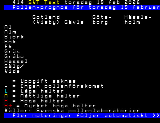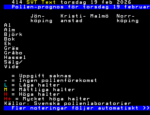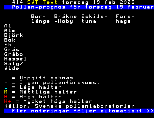 SVT Text Tors 19 Feb. 2026 Pollen-prognos för torsdag 19 februar Bor- Bräkne Eskils- Fors- länge -Hoby tuna haga Al Alm Björk Bok Ek Gräs Gråbo Hassel Sälg/ Vide = Uppgift saknas - = Ingen pollenförekomst L = Låga halter M = Måttliga halter H = Höga halter H+ = Mycket höga halter Källor: Svenska pollenlaboratorier Fler noteringar följer automatiskt >> +Dela 62 dagar