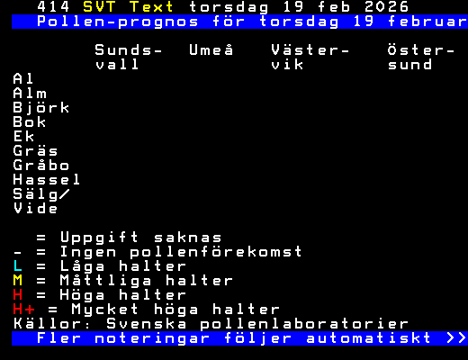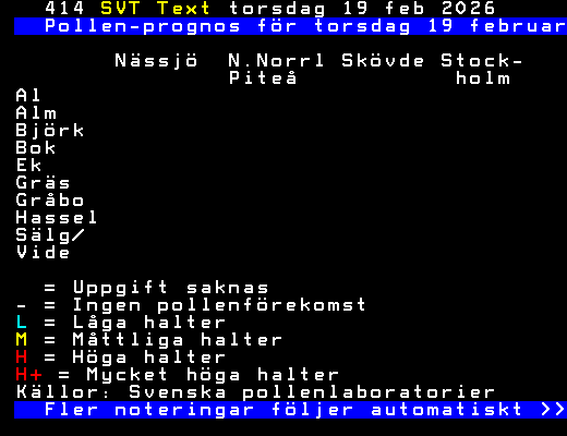 Pollen-prognos för torsdag 19 februar Nässjö N.Norrl Skövde Stock- Piteå holm Al Alm Björk Bok Ek Gräs Gråbo Hassel Sälg/ Vide = Uppgift saknas - = Ingen pollenförekomst L = Låga halter M = Måttliga halter H = Höga halter H+ = Mycket höga halter Källor: Svenska pollenlaboratorier Fler noteringar följer automatiskt >> +Dela 62 dagar