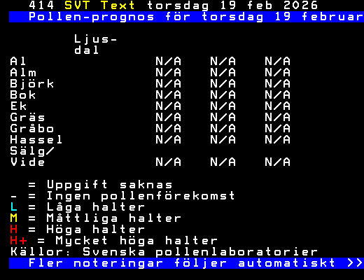 Pollen-prognos för torsdag 19 februar Ljus- dal Al N/A N/A N/A Alm N/A N/A N/A Björk N/A N/A N/A Bok N/A N/A N/A Ek N/A N/A N/A Gräs N/A N/A N/A Gråbo N/A N/A N/A Hassel N/A N/A N/A Sälg/ Vide N/A N/A N/A = Uppgift saknas - = Ingen pollenförekomst L = Låga halter M = Måttliga halter H = Höga halter H+ = Mycket höga halter Källor: Svenska pollenlaboratorier Fler noteringar följer automatiskt >> +Dela 62 dagar