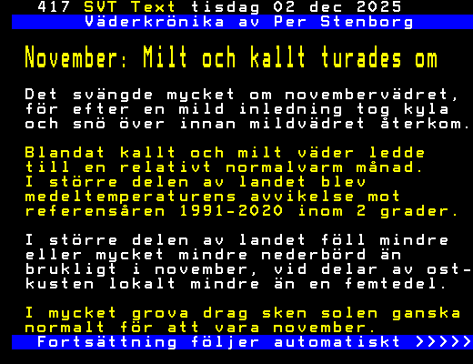 SVT Text Tis 02 Dec. 2025 Väderkrönika av Per Stenborg November: Milt och kallt turades om Det svängde mycket om novembervädret, för efter en mild inledning tog kyla och snö över innan mildvädret återkom. Blandat kallt och milt väder ledde till en relativt normalvarm månad. I större delen av landet blev medeltemperaturens avvikelse mot referensåren 1991-2020 inom 2 grader. I större delen av landet föll mindre eller mycket mindre nederbörd än brukligt i november, vid delar av ost- kusten lokalt mindre än en femtedel. I mycket grova drag sken solen ganska normalt för att vara november. Fortsättning följer automatiskt >>>>> +Dela 1 dag