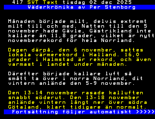 Väderkrönika av Per Stenborg Månaden började milt, delvis extremt milt till och med. Natten till den 5 november hade Gävle, Gästrikland inte kallare än 11,8 grader, vilket är nytt novemberrekord för hela Norrland. Dagen därpå, den 6 november, sattes lokala värmerekord i Halland. 16,0 grader i Halmstad är rekord, och även varmast i landet under månaden. Därefter började kallare luft så smått ta över i norra Norrland, dit vintern anlände den 5-9 november. Den 13-14 november rasade kalluften snabbt söderut. Den 13-18 november anlände vintern långt ner över södra Götaland, klart tidigare än normalt. Fortsättning följer automatiskt >>>>> +Dela 1 dag