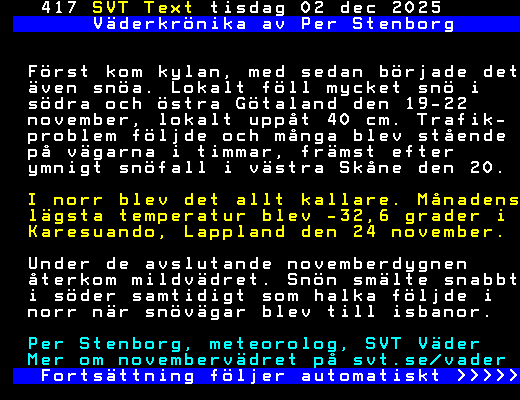 Väderkrönika av Per Stenborg Först kom kylan, med sedan började det även snöa. Lokalt föll mycket snö i södra och östra Götaland den 19-22 november, lokalt uppåt 40 cm. Trafik- problem följde och många blev stående på vägarna i timmar, främst efter ymnigt snöfall i västra Skåne den 20. I norr blev det allt kallare. Månadens lägsta temperatur blev -32,6 grader i Karesuando, Lappland den 24 november. Under de avslutande novemberdygnen återkom mildvädret. Snön smälte snabbt i söder samtidigt som halka följde i norr när snövägar blev till isbanor. Per Stenborg, meteorolog, SVT Väder Mer om novembervädret på svt.se/vader Fortsättning följer automatiskt >>>>> +Dela 1 dag