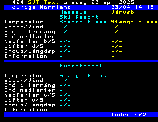 SVT Text Ons 23 Apr. 2025 Övriga Norrland 23/04 14:15 Hassela Järvsö Ski Resort Temperatur Stängt f säs Stängt f säs Väder/Vind -/- -/- Snö i terräng -/- -/- Snö nedfarter - - Nedfarter Ö/S -/- -/- Liftar Ö/S -/- -/- Snowb/Längdsp -/- -/- Information - - Kungsberget Temperatur Stängt f säs Väder/Vind -/- Snö i terräng -/- Snö nedfarter - Nedfarter Ö/S -/- Liftar Ö/S -/- Snowb/Längdsp -/- Information - Index 420 +Dela 14:25
