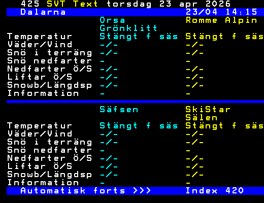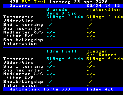 SVT Text Tors 23 Apr. 2026 Dalarna 23/04 12:15 Bjursås Fjätervålen Berg & Sjö Temperatur Stängt f säs Stängt f säs Väder/Vind -/- -/- Snö i terräng -/- -/- Snö nedfarter - - Nedfarter Ö/S -/- -/- Liftar Ö/S -/- -/- Snowb/Längdsp -/- -/- Information - - Idre Fjäll Kläppen Ski Resort Temperatur Stängt f säs Stängt f säs Väder/Vind -/- -/- Snö i terräng -/- -/- Snö nedfarter - - Nedfarter Ö/S -/- -/- Liftar Ö/S -/- -/- Snowb/Längdsp -/- -/- Information - - Automatisk forts >>> Index 420 +Dela 14:25