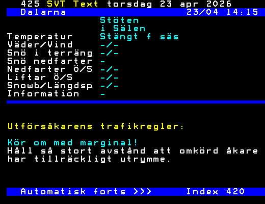 Dalarna 23/04 12:15 Stöten i Sälen Temperatur Stängt f säs Väder/Vind -/- Snö i terräng -/- Snö nedfarter - Nedfarter Ö/S -/- Liftar Ö/S -/- Snowb/Längdsp -/- Information - Utförsåkarens trafikregler: Kör om med marginal! Håll så stort avstånd att omkörd åkare har tillräckligt utrymme. Automatisk forts >>> Index 420 +Dela 14:25