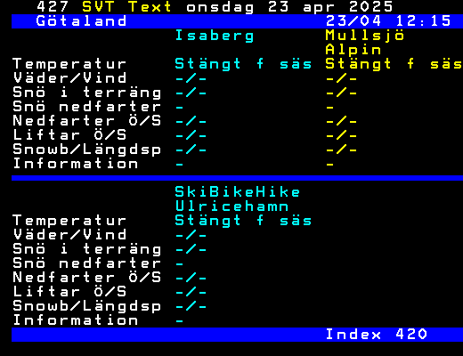 SVT Text Ons 23 Apr. 2025 Götaland 23/04 12:15 Isaberg Mullsjö Alpin Temperatur Stängt f säs Stängt f säs Väder/Vind -/- -/- Snö i terräng -/- -/- Snö nedfarter - - Nedfarter Ö/S -/- -/- Liftar Ö/S -/- -/- Snowb/Längdsp -/- -/- Information - - SkiBikeHike Ulricehamn Temperatur Stängt f säs Väder/Vind -/- Snö i terräng -/- Snö nedfarter - Nedfarter Ö/S -/- Liftar Ö/S -/- Snowb/Längdsp -/- Information - Index 420 +Dela 12:25