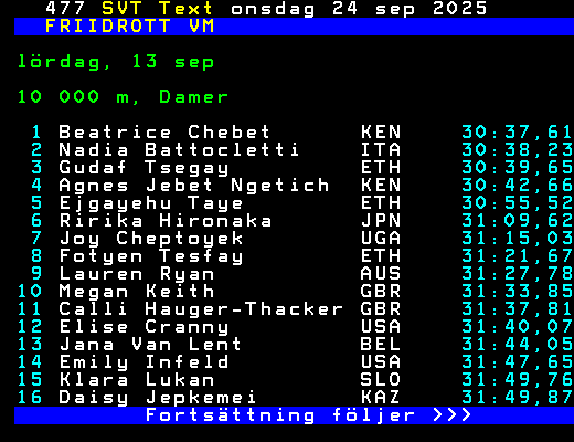 SVT Text Ons 24 Sep. 2025 FRIIDROTT VM lördag, 13 sep 10 000 m, Damer 1 Beatrice Chebet KEN 30:37,61 2 Nadia Battocletti ITA 30:38,23 3 Gudaf Tsegay ETH 30:39,65 4 Agnes Jebet Ngetich KEN 30:42,66 5 Ejgayehu Taye ETH 30:55,52 6 Ririka Hironaka JPN 31:09,62 7 Joy Cheptoyek UGA 31:15,03 8 Fotyen Tesfay ETH 31:21,67 9 Lauren Ryan AUS 31:27,78 10 Megan Keith GBR 31:33,85 11 Calli Hauger-Thacker GBR 31:37,81 12 Elise Cranny USA 31:40,07 13 Jana Van Lent BEL 31:44,05 14 Emily Infeld USA 31:47,65 15 Klara Lukan SLO 31:49,76 16 Daisy Jepkemei KAZ 31:49,87 Fortsättning följer >>> +Dela 71 dagar