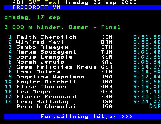 SVT Text Fre 26 Sep. 2025 FRIIDROTT VM onsdag, 17 sep 3 000 m hinder, Damer - Final 1 Faith Cherotich KEN 8:51,59 2 Winfred Yavi BRN 8:56,46 3 Sembo Almayew ETH 8:58,86 4 Marwa Bouzayani TUN 9:01,46 5 Doris Lemngole KEN 9:02,39 6 Norah Jeruto KAZ 9:06,34 7 Gesa Felicitas Kraus GER 9:14,27 8 Lomi Muleta ETH 9:14,90 9 Angelina Napoleon USA 9:17,44 10 Kaylee Mitchell USA 9:18,66 11 Elise Thorner GBR 9:19,02 12 Lea Meyer GER 9:24,42 13 Flavie Renouard FRA 9:25,15 14 Lexy Halladay USA 9:34,03 Peruth Chemutai UGA DNF Fortsättning följer >>> +Dela 69 dagar