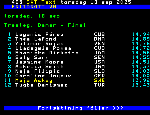 SVT Text Tors 18 Sep. 2025 FRIIDROTT VM torsdag, 18 sep Tresteg, Damer - Final 1 Leyanis Pérez CUB 14,94 2 Thea LaFond DMA 14,89 3 Yulimar Rojas VEN 14,76 4 Liadagmis Povea CUB 14,72 5 Shanieka Ricketts JAM 14,56 6 Saly Sarr SEN 14,55 7 Jasmine Moore USA 14,51 8 Ackelia Smith JAM 14,37 9 Neja Filipic SLO 14,03 10 Caroline Joyeux GER 14,00 11 Maja Åskag SWE 13,92 12 Tugba Danismaz TUR 13,43 Fortsättning följer >>> +Dela 77 dagar
